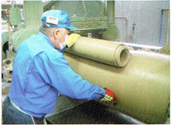 靴底の原料となるゴムをローラーで練り上げていきます。