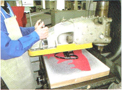 ゴム成形・生地縫製の工程板状になったゴムを四角形の1枚のパーツに裁断して、